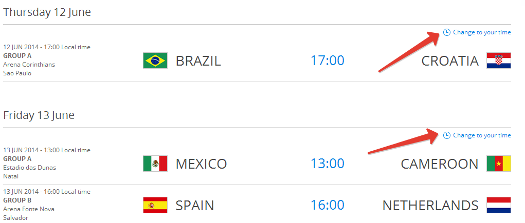 Fifa-ի պաշտոնական էջում իհարկե չէին կարող հաշվի չառնել Բրազիլիայի ու մնացած երկրների միջև եղած ժամային գոտիների տարբերությունը: Այդ նպատակով այս կայքում կա մի կոճակ, որը թույլ է տալիս ցուցադրել ժամերը ըստ Բրազիլիայի ժամային գոտու, կամ ըստ կայքի այցելուների գտնվելու վայրի ժամային գոտու: Այդ կոճակը գտնվում է ցանկացած խաղի վերևի աջ մասում: