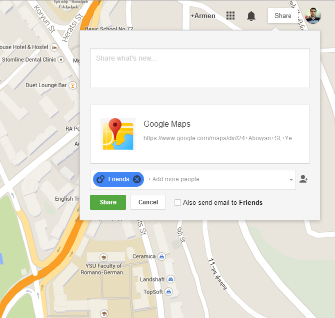 Google+ ցանցի և Google Maps ծառայության համագործակցությունը թույլ է տալիս Google+ ցանցում ընկերների հետ կիսվել Ձեր գտնվելու վայրով: Google+ ցանցը ցուցադրում է նաև Ձեր գտնվելու վայրի մասին ընկերների կարծիքները: